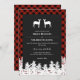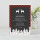 Rustikale lesbische Hochzeitseinladung mit einem roten Büffel-Karo-Muster, ein Paar Dosen und, am Ende der rustikalen Hochzeitseinladung, schneebedeckte Fichten.