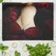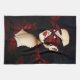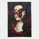 Eine schwarzhaarige Frau, die eine Maske mit rotem Schmetterling trägt und mit roten Schmetterlingen umringt ist, in einer schwarzen Kulisse.