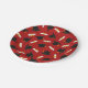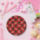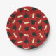 Graduation party paper plates printed with a red pattern of graduation caps and diplomas with a yellow ribbon.