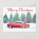 Roter Chevrolet und Weihnachtskoniferen. "Frohe Weihnachten" Grußtext.
