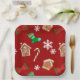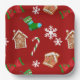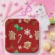 Festliche Teller mit Schneeflocken, Bonbons, Lebkuchenhäusern, Bogen und Weihnachtsfeiern.