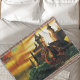 Ein fantasievoll roter Drache, der bei Sonnenuntergang ein Schloss bewacht.