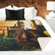 Ein fantasievoll roter Drache, der bei Sonnenuntergang ein Schloss bewacht.