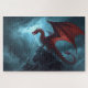 Crashing wind effects and dramatic lighting contrast the dragon’s vibrant crimson tones against dark blue and gray storm skies, enhancing depth and visual intensity. This jigsaw puzzle provides a satisfying challenge for fantasy lovers, dragon art collectors, and fans of mythical creature designs.