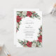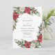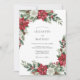 This design evokes a classic holiday atmosphere with rich winter foliage. It features striking red poinsettias, creamy white roses, and rustic pinecones. Lush evergreen needles, holly berries, and sage green leaves create a festive botanical arrangement against the crisp background. This artwork is perfect for a seasonal nuptial event.