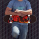 ein dekoratives Drachenwerk in Rot- und Orangetönen, das wie Flammen im Tätowierstil eines Stammes auf einem Skateboard erscheint.
