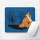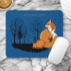 Ein roter Fuchs sitzt neben Kürbissen und Herbstblättern, einige Herbstblätter fliegen hinter dem Fuchs in Richtung Wald