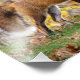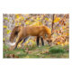 Ein Fuchs hält an, um von einem Hügel mit einem Hintergrund der Herbstfarbe zu schauen.