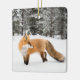 Red fox with bushy tail in cold white snow. Tall green pine tree forest in the background. Beautiful nature.
