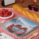 Schneeflocken auf roten Handschuhen auf einer Winterwaldszene mit WINTER-Text.
