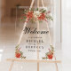 Amaze your guests with this elegant wedding welcome sign featuring beautiful red poinsettia flowers and rustic pine leaves.