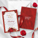 Genießen Sie Luxus zu einem erschwinglichen Preis mit dieser eleganten, blumengeschmückten Einladung. Ein metallischer Hintergrund, ein weißer Satin und ein vergoldeter, filigraner Juwelierrahmen verbinden sich mit reichhaltigen rote Rosen für das ultimative Hochzeitsdesign. Der Bordeaux-Text in klassischen formellen Schriftart kann leicht für Ihren ganz besonderen Tag personalisiert werden. Auf der Rückseite ist ein dekoratives Skriptmonogramm in komplementären Farben.