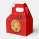 Komposition mit goldenem traditionellem chinesischen Papierschnitt eines Kaninchens in einen dekorierten Kreis + kleine moderne Schrift für das Jahr des Kaninchens 2023 und Chinesisches Kaninchen Ideogramm Symbol auf einen kleinen schwarzen Kreis. Design auf Gable Gevor Box + Business Name und Adresse, um mit rotem Hintergrund anpassen. Erhältlich in Würfel, Zelt und Gate-out-Gutschachteln. Matching Grußkarte, Ferien Postkarte, Einladung, Party Vorräte und mehr. Ideal für Chinesisches Neujahr des Kaninchens 2023 oder Geburtstag (Menschen geboren im Kaninchenjahr).