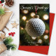 Elegante Weihnachtskarte mit einem nahen Foto eines Golfballschmucks, das an den Ästen eines Weihnachtsbaumes hängt. Kartentexte sind vollständig personalisierbar. Brauchst du Hilfe? Kontaktieren Sie uns für Hilfe personalisieren oder mit Anpassungen. Gute Ferien!