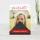 Élégant script annonce votre diplômé sur votre photo senior préférée sur le devant. Bloquez leur nom sur le devant, et tous les détails de la cérémonie à l'intérieur avec une autre photo. Back inclut un espace pour relayer leurs plans futurs ou inclure un message de remerciement. Design disponible en couleurs scolaires de rouge, orange, violet, vert, bleu, orange brûlé, marron et noir. Produits correspondants disponibles.