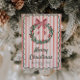 Wenn Sie eine einfache minimalistisch schöne und leicht bearbeitbare Weihnachtskarte suchen. Dieser ist perfekt für dich. Und wie Sie sehen, das Design zeigt eine grüne Hand gemacht und gezeichnet Weihnachtskranzbogen. Mit grüner und rosa handgeschriebener Typografie von MERRY CHRISTMAS. Und Ihr Familienname und das Jahr darunter. Und hinten got du einen anpassbaren Weihnachtsgrüßteil und Band oben. Alle auf roten Streifen. Und in einem gewellten, grünen Rahmen.