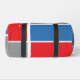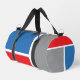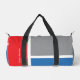 A clean design in three colors: red, gray, and blue, separated by white lines. The individual texts are located at the front right and on the side. All areas have the same colors, but the arrangement is different.