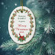 Hier ist ein hübsches Weihnachtsgeschenk, das ein schönes Familiengeschenk macht. An der Vorderseite befindet sich ein ovaler Kranz mit grünen Blätter, heiligen Beeren, Weihnachtskeksen, Süßigkeiten und einem hellen, roten Kardinal. In der Mitte befinden sich benutzerdefinierte Textfelder, die grün und rot übereinstimmen. Die Rückseite des Ornaments hat den gleichen Holiday Kranz und mehr benutzerdefinierte Textfelder.