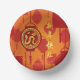 Rote und orangefarbene Silhouetten verschiedener chinesischer Laternen als Hintergrund + Goldene vertikale chinesische Wünsche + Happy New Year in Englisch + kleine goldene Papier-Schnitt einer Schlange auf einer roten Laterne. Design auf Party Papierschale. Sie können dieses kleine Bild löschen, wenn Sie gewollt haben, das Design für alle chinesischen Neujahre zu verwenden. Passende Grußkarte, horizontale Ferien Postkarte, Aufkleber und mehr. Perfekt für das chinesische Neujahr der Schlange 2025.