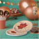 Party-Papierdruckpapier-Teller mit rotem Blatt. Rustikaler heller Holzboden mit großen roten Ahornblättern in der Mitte. Passen Sie den gebogenen, gedruckten Text unten an, um Ihre Veranstaltung zu feiern.