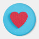 Dieses Design zeichnet sich durch ein leuchtend rotes Herz aus, das ursprünglich aus Filz hergestellt wurde; es ist Set vor einem hellblauen Hintergrund.