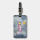 Personalisierter Gepäckanhänger mit einem skurrilen rot gestreiften Leuchtturm und einem bunten Beachball, der an der Wand ruht. Eine graue Möwe fliegt in der Ferne ab. Eine gelbe Sonne lächelt glücklich am Himmel. Gewitterte stürmische Wolken, die sich von hinten anschließen. Digitales Bild erstellt mit Aquarellen.