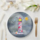 Teller aus Papier mit einem skurrilen, rot gestreiften Leuchtturm und einem bunten Beachball, der an der Wand ruht. Eine graue Möwe fliegt in der Ferne ab. Eine gelbe Sonne lächelt glücklich am Himmel. Gewitterte stürmische Wolken, die sich von hinten anschließen. Digitales Bild erstellt mit Aquarellen.