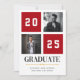 Célébrez le jalon de votre diplômé avec ce faire-part de graduation de collage photo rouge moderne. Ce design comporte deux espaces réservés aux photos et une mise en page audacieuse et variée avec l'année affichée en évidence. Customisez-le avec le nom de votre diplômé et le lycée. Une façon élégante et contemporaine d'annoncer leur réalisation !