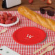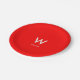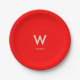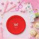 Trendy Personal Party Paper Teller mit rotem Hintergrund, großes zentriertes Monogramm und assoziiertem Namen. Saubere, einfache minimalistische Typografie. Vollständig personalisierbar.