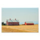 "Red Montana Barns" von Catherine Sherman. Ein geerntetes Weizenfeld grenzt an rote Scheunen auf einem Bauernhof von Montana an. Der große Himmel ist klar blau. In der Ferne liegen die Rocky Mountains.