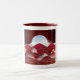 Abstraktes Landschaftsdesign in verschiedenen Rottönen mit einem Mondschein, Hügeln, Bäumen, Wolken und Vögeln.