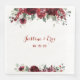 Hochzeitsnapkins mit einem Aquarell-Bouquet aus tiefbordeauxroten Pfannkuchen und grünen Eukalyptus-Grünanlagen, die über Ihren Vornamen und numerischen Datum kaskadieren.