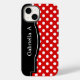 Stilvolle iPhone-Hülle mit weißen Polka-Punkten über rotem Muster, einem schwarzen Rahmen über der links Seite und personalisiert mit Ihrem Namen oder benutzerdefinierten Text in Weiß über den schwarzen Rahmen. Dieses Design ist perfekt für den vertikalen und horizontalen Einsatz des Handys.