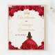 Dieses elegante und glamouröse Begrüßungsschild aus Quinceañera besticht durch eine schöne Prinzessin mit dunklem Haar in einem roten Ball-Gown. Der Text kombiniert handgeschriebene Skripte mit modernen serifenlosen Schriftart für ein elegantes und raffiniertes Aussehen. Die Blumenarrangements und die Goldkonfetti bilden die perfekte Mischung aus rustikal und schick. Grafiken von www.etsy.com/uk/shop/SunflowerDayLove