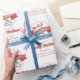 Dieses Design ist mit einem Weihnachtspapier-Design mit einem modernen Urlaubsmuster, einem Retro-Vintag, festlich rot und weiß, Weihnachtsmann, mit einem Rentierwanderweg, einem niedlichen whimsical Spaß, Typografie, Kalligrafie, einzigartiges Geschenkpapier