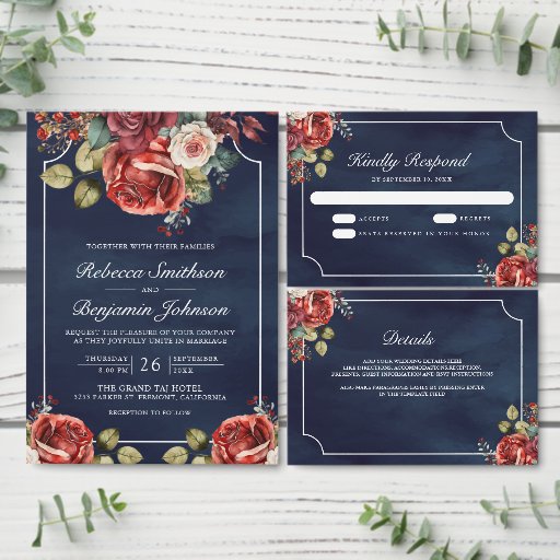 Red Roses Floral Frame Navy Blue QR Code Wedding Einladung
