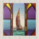 Dieses Design verfügt über ein Segelboot mit einem großen roten und gelben Segel auf einem smaragdgrünen Ozean, als ob es durch ein Fenster gesehen wird. Das wäre ein bunter, bunter Wasserdesign für ein Strandhaus oder einen sommerlichen Look in jedem Haus. Das Fenster weist Formen in Rot, Grün, Blau und Gold auf, die einen simulierten farbigen Glass-Look ermöglichen. Das Bild auf der Kachel ist flach und lackiert und nicht aus Buntglas. Das Bild wurde als "#generativecintent" erstellt, mit zusätzlicher Filterung und Manipulation mit einem Grafikprogramm, um das gläserne Aussehen zu simulieren.
