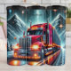 Dieses Bild zeigt einen lebendigen roten Sattelwagen mit Chromakzenten, der auf einer von schneebedeckten Bergen umgebenen Straße unter einem dunklen, sternenstarken Nachthimmel fährt. Helle, leuchtende Lichtwege in Orange und Rot strahlen vom LKW aus und beleuchten die Straße und schaffen so eine dynamische und ätherische Szene. Fallende Sterne oder Lichtpartikel tragen zur magischen Atmosphäre bei.
