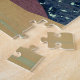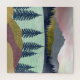 Diese wunderschöne abstrakte Landschaft zeigt eine Bergszene mit einem See und einem mehrfarbigen Himmel in Rot-, Zyan-, Blau-, Gelb- und Goldtönen.