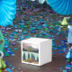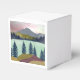 Diese wunderschöne abstrakte Landschaft zeigt eine Bergszene mit einem See und einem mehrfarbigen Himmel in Rot-, Zyan-, Blau-, Gelb- und Goldtönen.