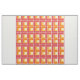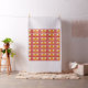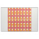 Dieser Stoff hat ein geometrisches Design von L's in rot, orange und gelb, platziert in verschiedenen Richtungen auf einem Feld von weiß.