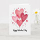 This greeting card features five heart-shaped balloons floating up from the lower part of the design. They’re painted in watercolor shades of red and pink, with soft edges and gentle brush marks that make them feel hand-painted. The hearts overlap a little, and each one looks slightly different in tone, from pale blush to deep red. Around the main group, small loose hearts in light pink and soft silver-gray are scattered across the white background like confetti. The overall setting is simple and airy, keeping the focus on romance and sweet affection ❤️💌. Near the bottom, the words “Happy Valentine’s Day” appear in a flowing script style, written in a dark gray tone that stands out without feeling heavy. It’s an easy, heartfelt design that would pair nicely with a kind note and maybe a little treat 🍫.