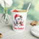 Diese festlichen Tassen in Rot und Weiß mit einem niedlichen Pinguin, einem winzigen Schneemann und heiligen Beerengrün sind mit einem fröhlichen Weihnachtsgeschenk-Sprichwort und einer Vorlage für Ihren Familiennamen ausgestattet, um sie für das Weihnachtsfest zu personalisieren.
