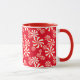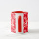 Eine Tasse mit einem süß-rot-weiß gestreiften Pfefferminzbonbons auf rotem Hintergrund.
