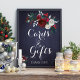 Karten und Geschenke Hochzeitsschild mit floralfarbenem Aquarellbouquet in trendigen winterroten bzw. weißen Rose mit piniengrünen, saisonalen Tannenzweigen, roten Beeren und Blattwerk über einem dunkelmarineblauen Kalkbrett. +++++++++++++++ Perfekt für eine elegante, rustikale Hochzeit im Winter / Weihnachten.