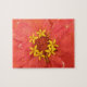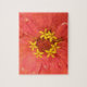 Dieses phantastische Rätsel enthält ein detailliertes nah-up Foto einer hübschen roten Zinnia-Blume. Das Foto wurde mit Makrofotografie aufgenommen und zeigt die lebhaften Rot- und Gelbblütenfarben und die faszinierenden Details dieser wunderschönen Blume.