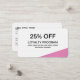 Idéal pour promouvoir votre entreprise, vos produits et vos services. Ces cartes de réduction sont un achat extraordinaire pour la récompense de vos clients fidèles. Sélectionnez un stock papier haut de gamme pour une qualité ajoutée. Pour les demandes spéciales, contactez le concepteur. ©2010 Joshua Martin