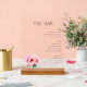This wedding menu card features a minimalist and modern design with a muted gray background, creating an elegant and sophisticated look. The layout is clean and organized, with bold sans-serif typography for the title "THE BAR" and neatly arranged sections for beer, wine, and spirits. A delicate illustration of pink peonies adds a touch of color and natural beauty to the bottom-left corner, balancing the structured text. Perfect for weddings, this design conveys a refined and contemporary atmosphere, making it easy for guests to navigate their beverage options.