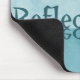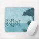 Ein grün-blau strukturierter zeichn mit der Silhouette eines Mannes, der unter einem Baum sitzt, durch einen Teich, der darüber nachdenkt. Das Wort "Reflektieren" Erholungen auf der Seeoberfläche, Text und Schatten, die sich im vollkommen stillen Wasser widerspiegeln.
