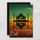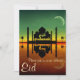 Mosquée à l'illustration de nuit : Une mosquée et une silhouette de paumes sur un arrière - plan de ciel nocturne avec la lune et les étoiles réfléchissant sur l'eau.